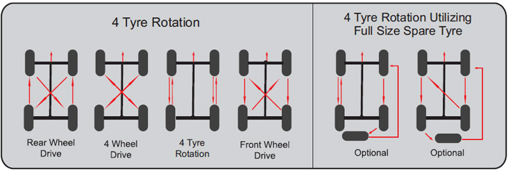 It’s suggested that tyres should be transposed as soon as the phenomena above mentioned are detected (especially the two front wheels). The tyre transposition patterns are acceptable below. Please refer to your vehicle owner's manual regarding tyre transposition on advice.